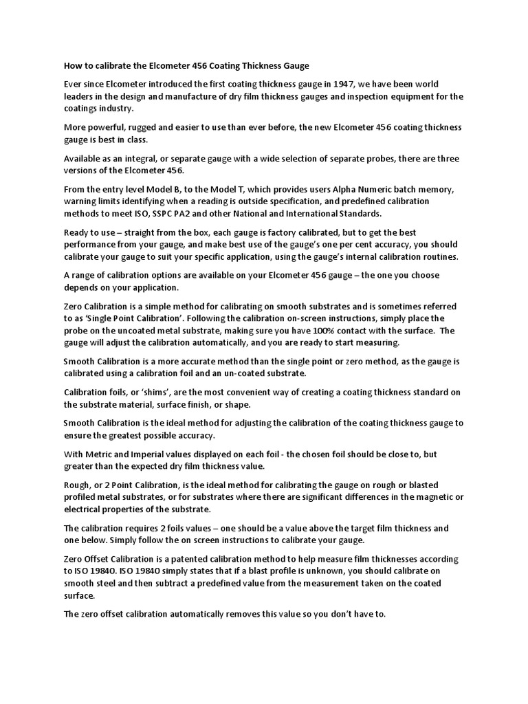 The gauge is available in four models. Elcometer 456 separate coating thickness gauge during each scan the elcometer 456 displays the live thickness reading together with an analogue bar graph which graphically indicates the thickness relative to both the nominal thickness and any user defined limits. This elcometer are world leaders in the design manual describes manufacture and supply of coatings inspection operation equipment. The gauge is available in three versions.