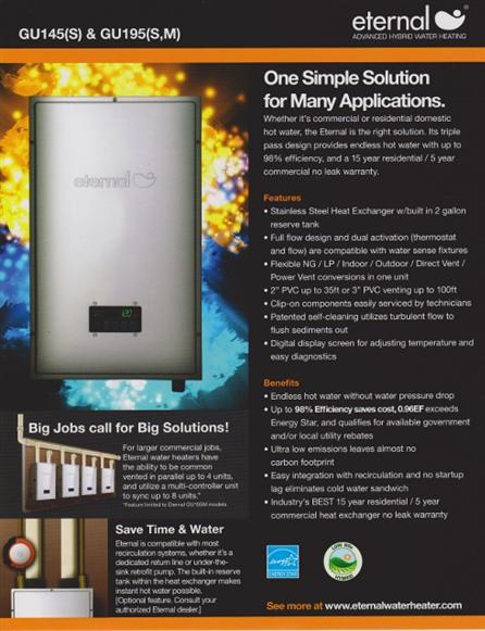 Eternal water heater model gu195s. The hybrid takes advantage of tankless technology and storage tank water heater. In commercial applications the gu195s can be combined with additional storage to support unpredictable surges in demand for hot water. An eternal hybrid water heater provides endless hot water at high volume at an incredible efficiency of up to 98 with high flow rates. I called the technical support and they ask me to open the inside of water heater so they can find out exactly what was wrong.